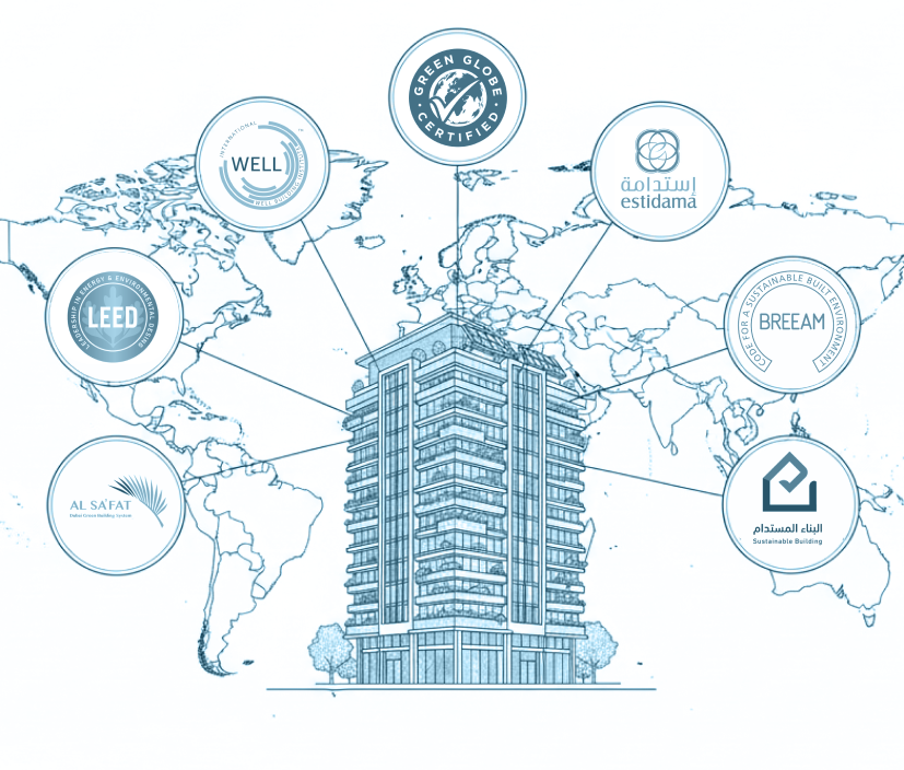 At PuzzeGreen, we help projects achieve internationally recognized sustainability certifications that validate performance, wellness, and environmental responsibility. Our team provides end-to-end consultancy for frameworks such as LEED®, WELL®, Estidama®, BREEAM®, Green Globe, Al Sa’fat, and Mostadam, tailoring strategies to meet both global benchmarks and regional priorities.