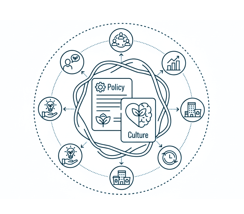 Our approach combines change management principles, ISO® standards, and global sustainability frameworks such as the UN SDGs, LEED®, and WELL®, ensuring that policies are both compliant and effective. By aligning structural rules with behavioral incentives, we create a self-sustaining ecosystem where policy drives action and action reinforces culture.